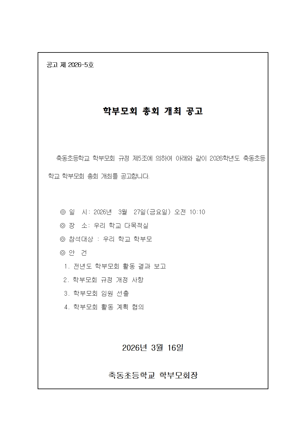 2026학년도 학부모회 총회 개최 공고
